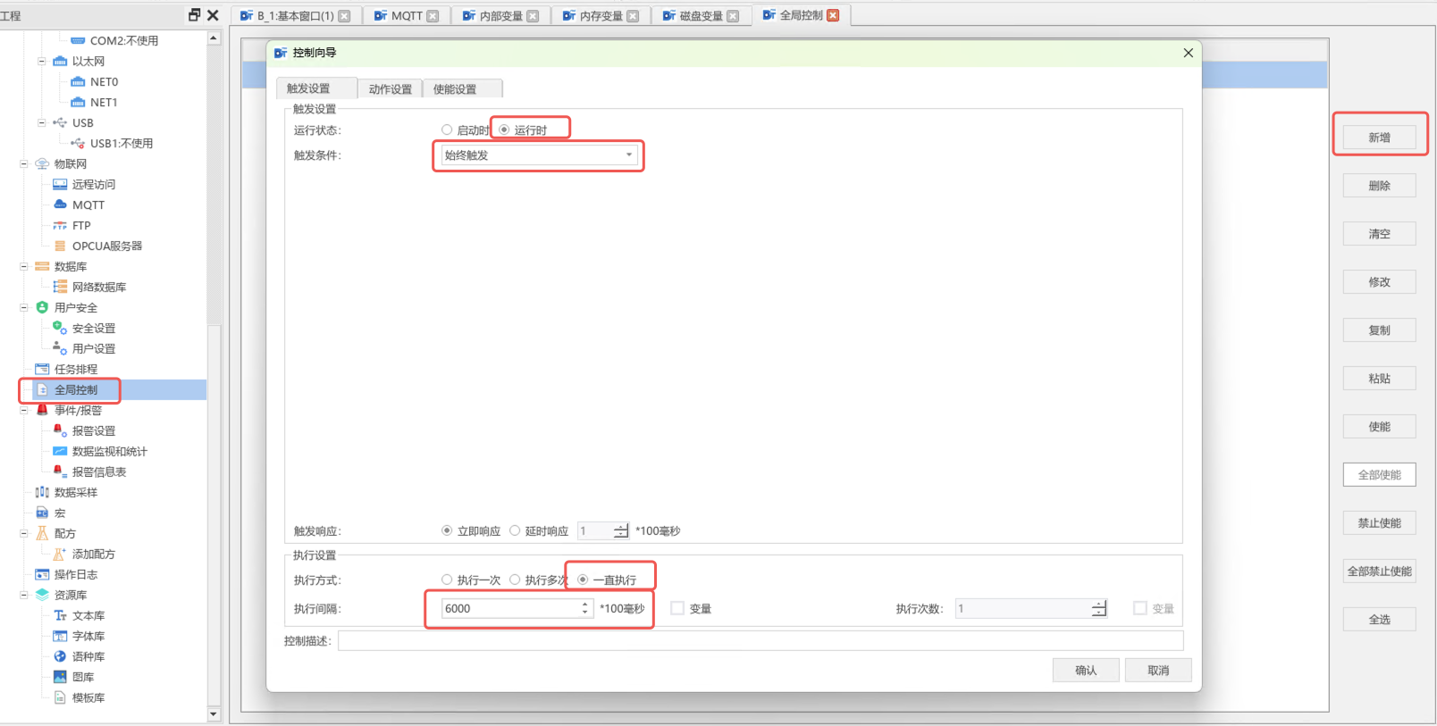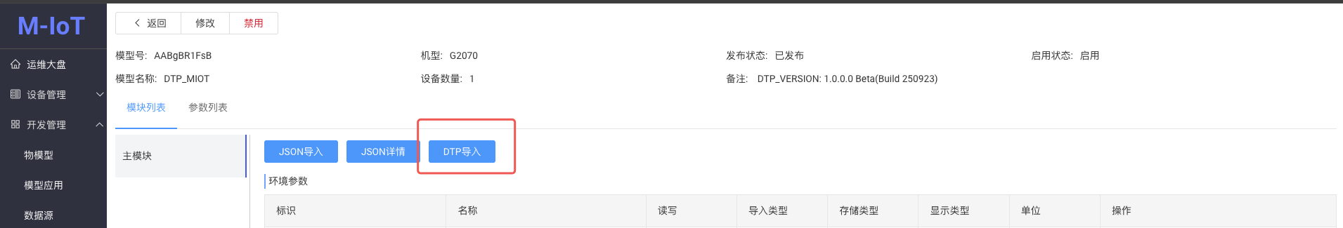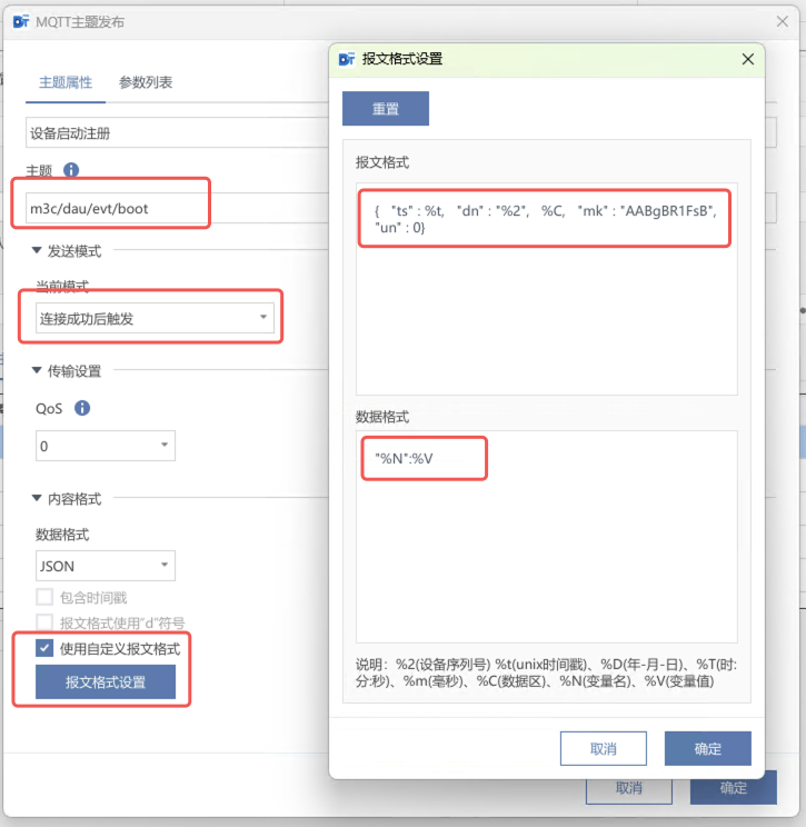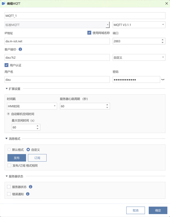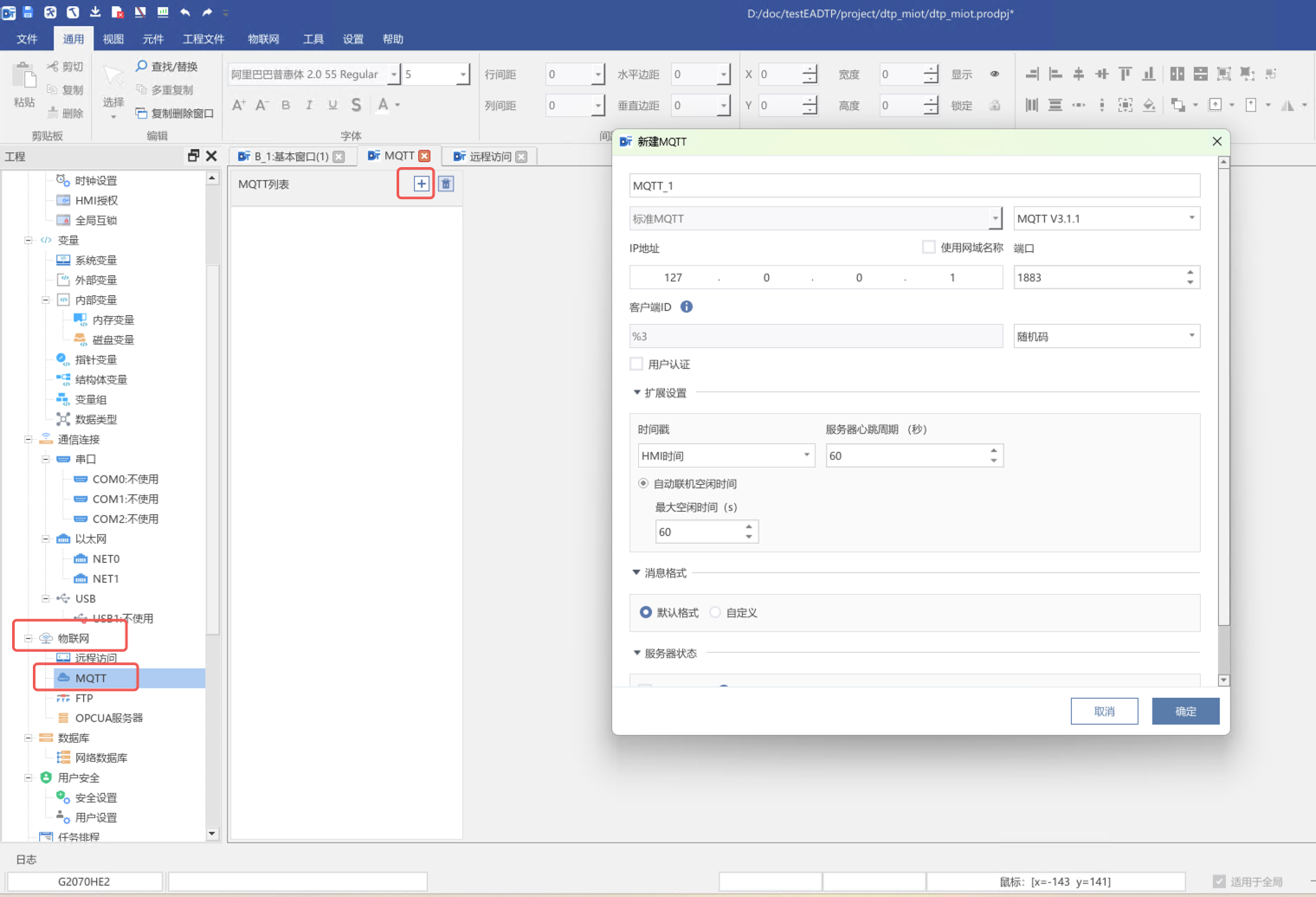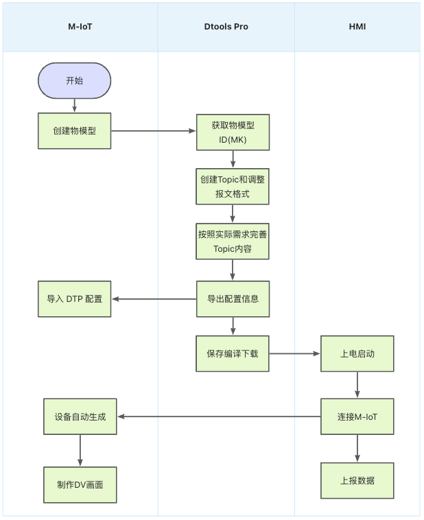 案例使用DTP的MQTT插件对接本页总览使用DTP的MQTT插件对接 使用步科 Kinco DToolsPro 软件中 MQTT 功能连接 M-IoT 平台 前提条件 用户至少具备一台步科F2 / G2 / GL2系列的触摸屏硬件,且触摸屏具有连接互联网的条件(以太网 / WiFi / 4G 网络均可)。本案例中选择的触摸屏型号为 G2070E; 用户电脑已安装Kinco DToolsPro V1.9.0及以上版本的组态软件,并能正常使用; 用户已拥有Kinco M-IoT平台管理权限的账号。 配置流程图 操作步骤