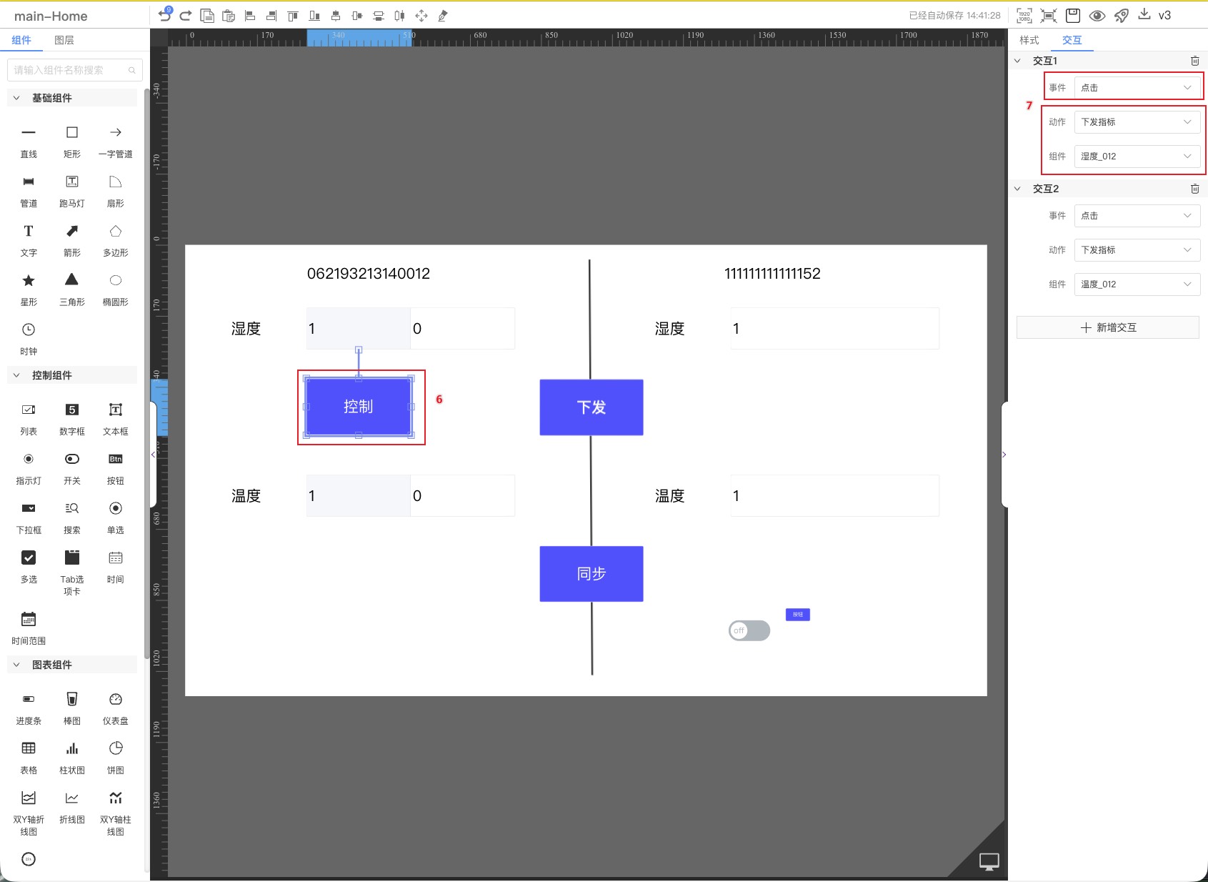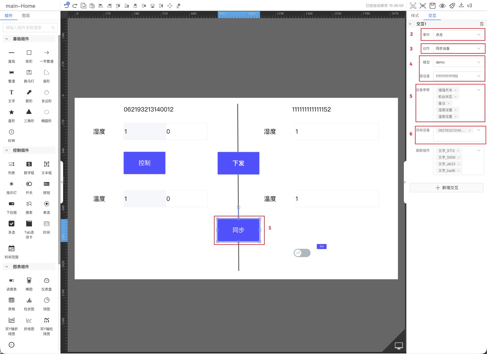 点击事件选择【下发指标】动作来实现下发参数(可以同时下发多个)